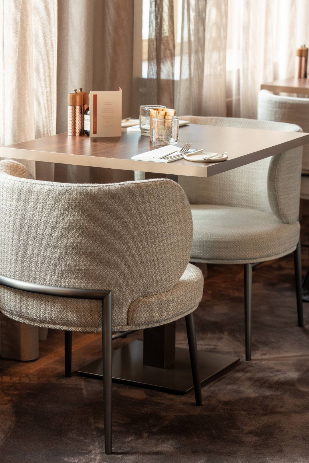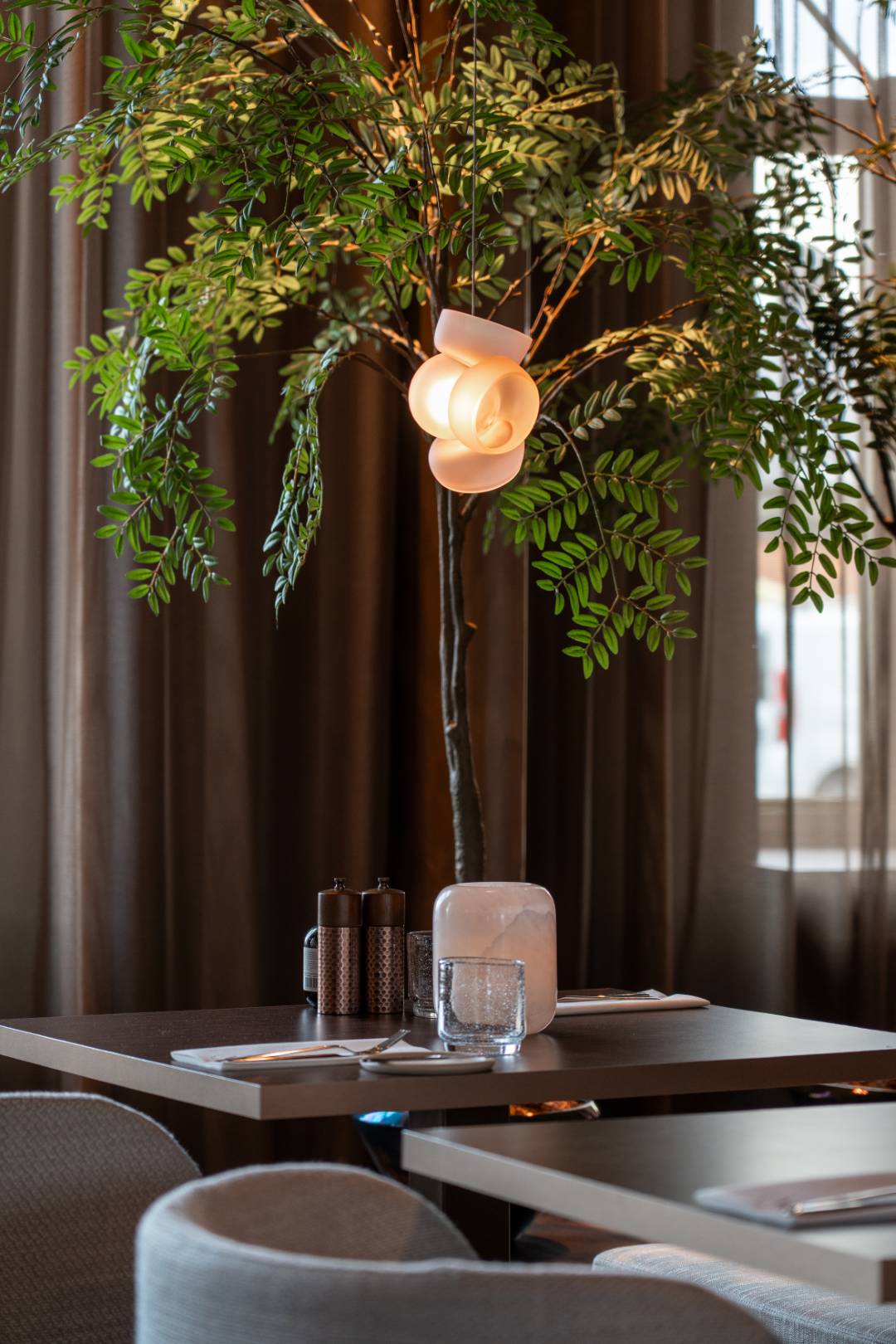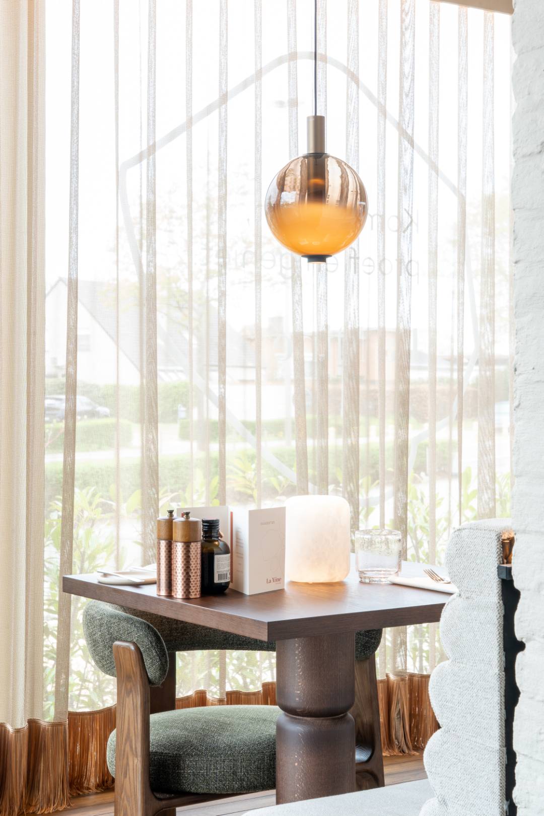 Bij La Mine is elk detail doordacht, van de warme, zachte verlichting tot de verfijnde inrichting. Organische hanglampen creëren een subtiele gloed boven de tafels, terwijl indirecte verlichting langs de wanden een serene ambiance brengt. Strategisch geplaatste spots accentueren de rijke materialen en elegante afwerking. In samenwerking met Dr. Light en Dr. Home hebben we een harmonieus totaalconcept gecreëerd, waar licht en interieur samensmelten tot een unieke en stijlvolle beleving.